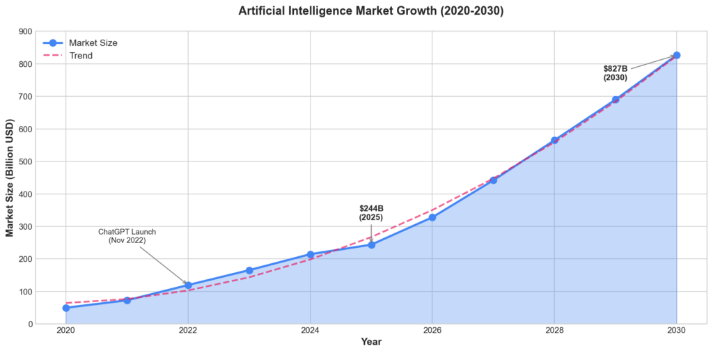 The global AI market has reached **$244 billion** in 2025, driven by the widespread adoption of agentic AI systems that can reason, plan, and execute complex tasks autonomously [1]. The market is projected to grow at a CAGR of 19.8%, reaching **$826.7 billion** by 2030.